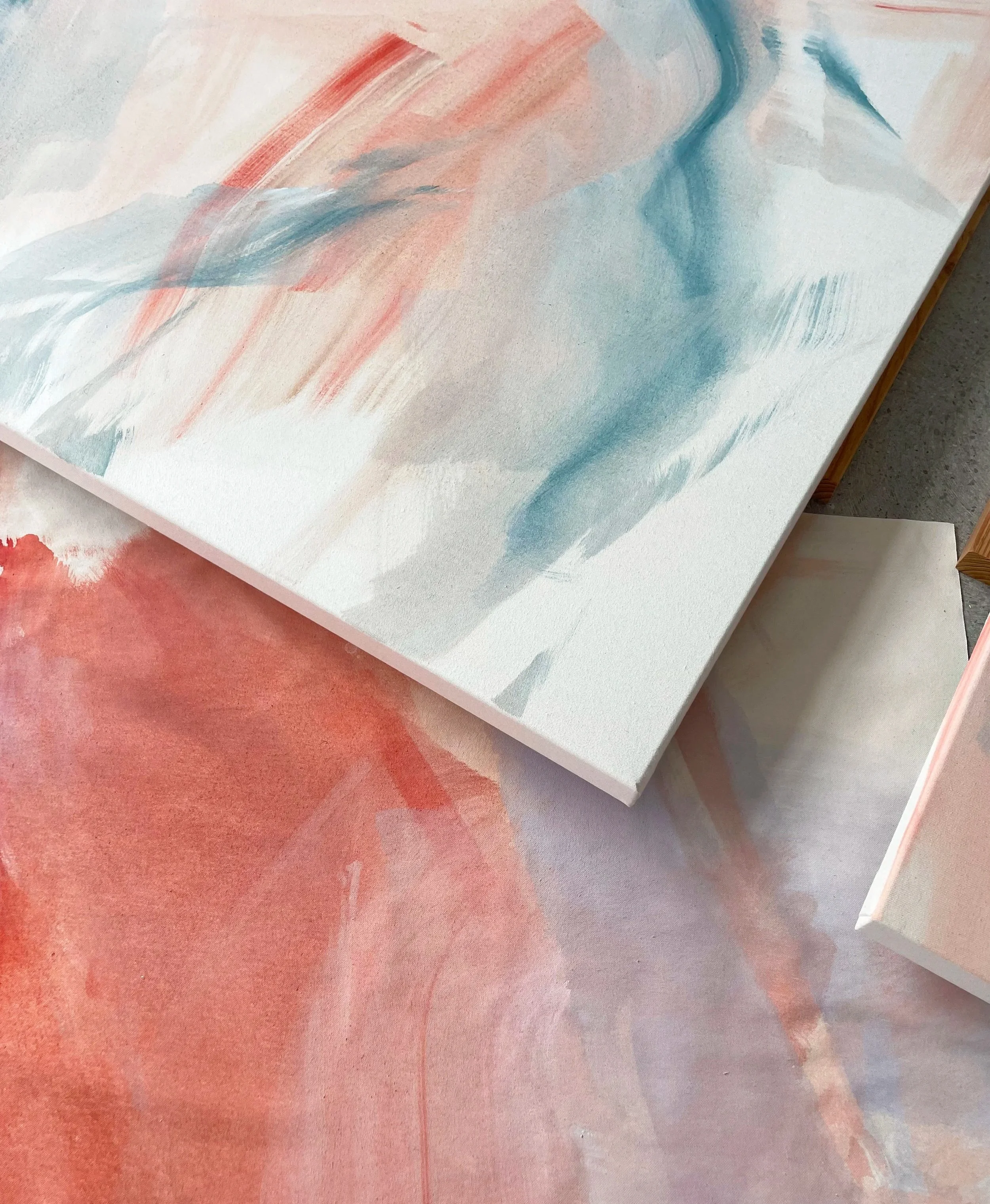 Touching Water is an ongoing body of large-scale abstract paintings. The series reflects on fleeting moments of awareness — small encounters that bring us back into presence. Touching water, feeling air, sensing movement: simple gestures that reveal the quiet intensity of being alive.
