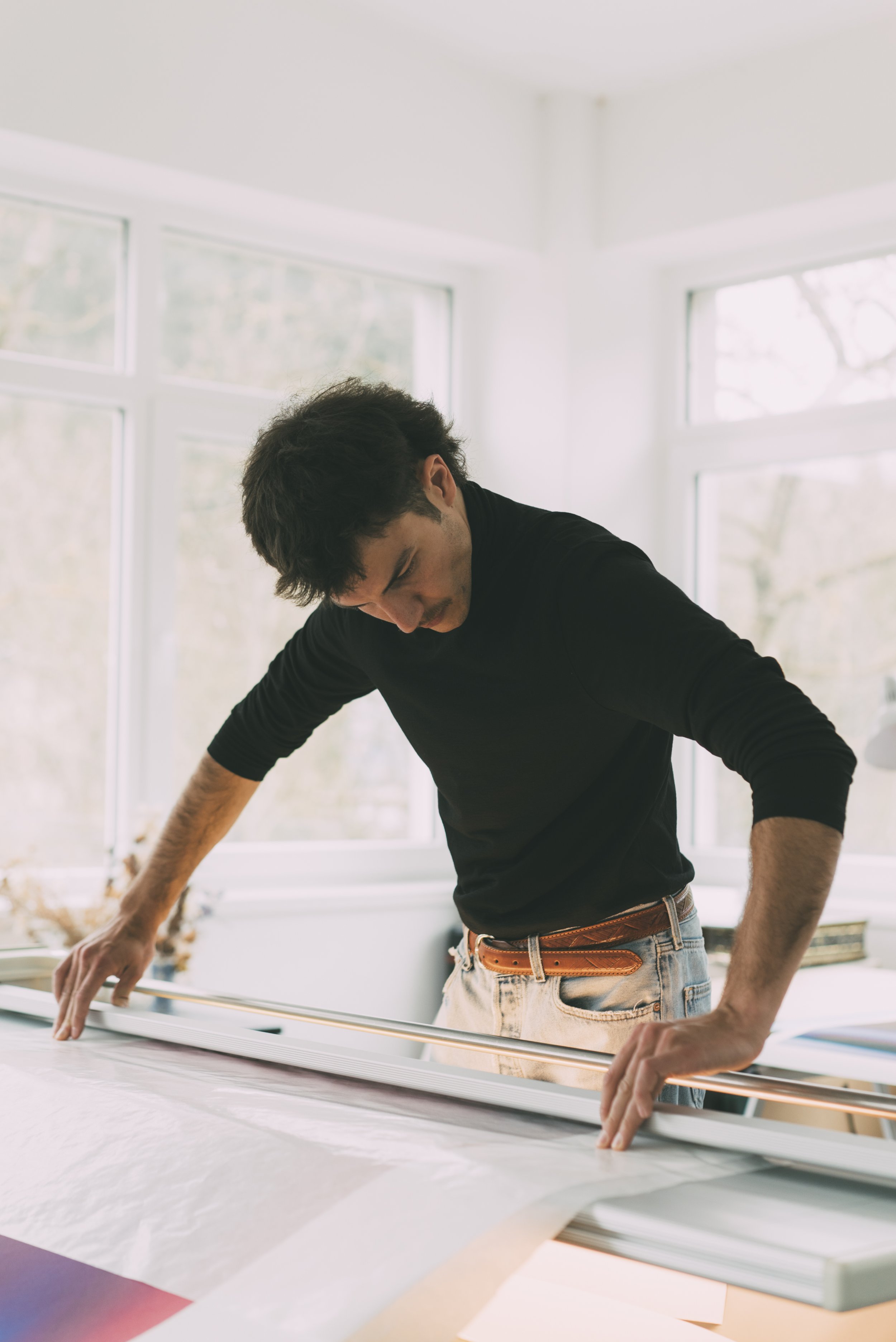 Florian Leible works in the field of large-scale abstract painting. Rooted in a background of craftsmanship and graphic arts, his practice is grounded in material awareness and spatial clarity. His paintings explore movement as a fundamental condition of being — subtle shifts of color, surface and density that generate atmosphere rather than depict it.